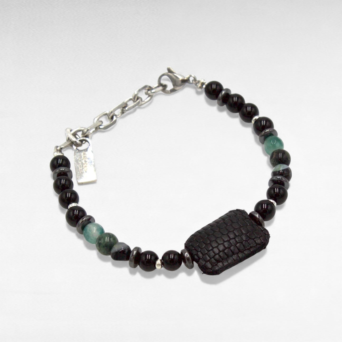 צמיד שרשרת כסף זה , הוא אביזר אופנתי ומודרני שישלים את התלבושות היומיומיות שלך. הוא כולל גימור מעצבים. [Petek] עטוף בעור נחש שחור אמיתי.