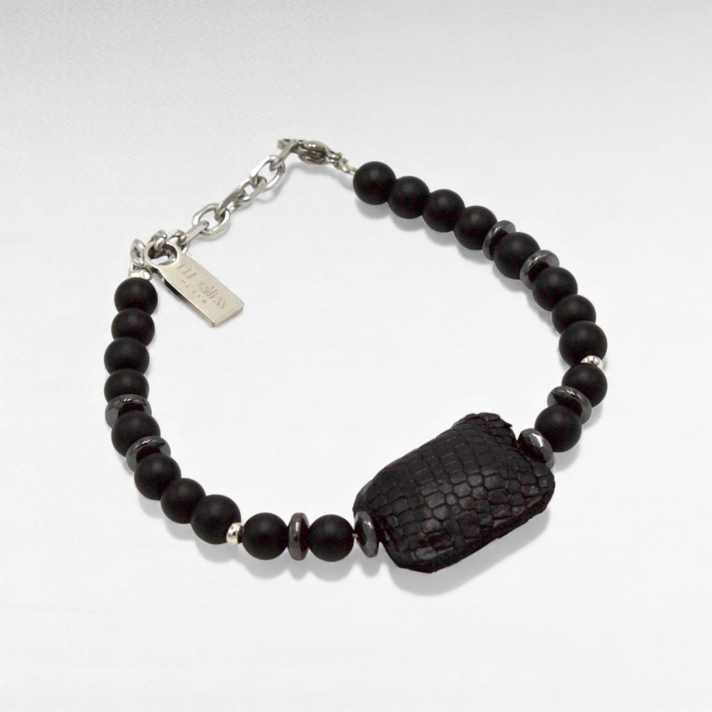 This silver chain bracelet adorned with semi-precious black agate beads is a trendy and modern accessory that will complement your everyday outfits. To better distinguish itself from traditional bracelets, it features a designer finish. A signature detail par excellence is a reproduction of Petek parchment wrapped in genuine matte black lizard skin.