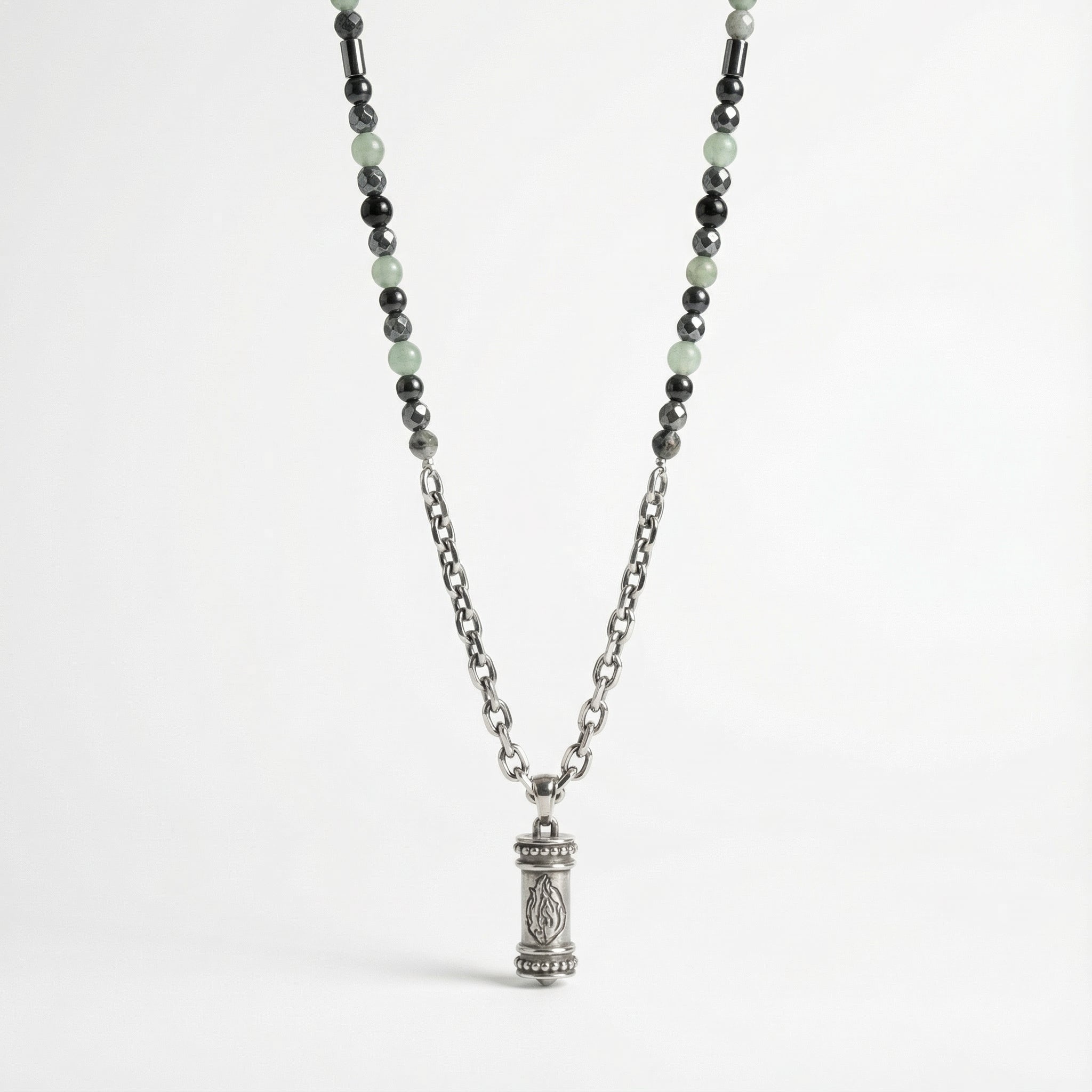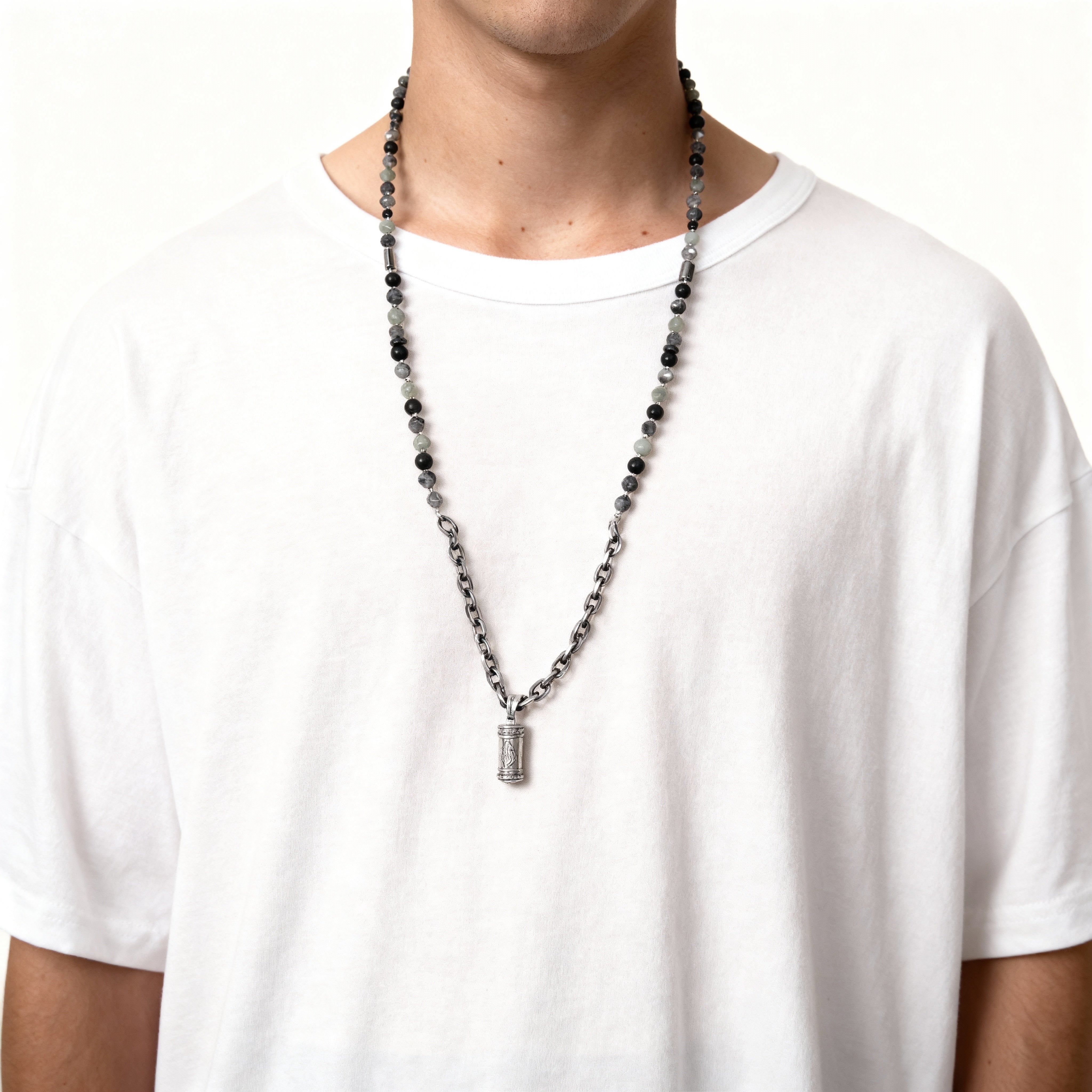 Each necklace is handmade from genuine semi-precious beads — agate, onyx, jasper and other natural stones carefully selected for their beauty and vibration.