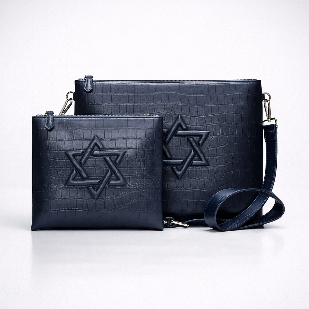 Ce set en cuir Bleu marine croco gaufré comprend deux pochettes élégantes et pratiques pour Tallit et Téfilines. Leur large ouverture et leur capacité généreuse offrent un confort d’utilisation au quotidien. Souples mais structurées, elles peuvent également servir de pochette raffinée ou de petit porte-documents.