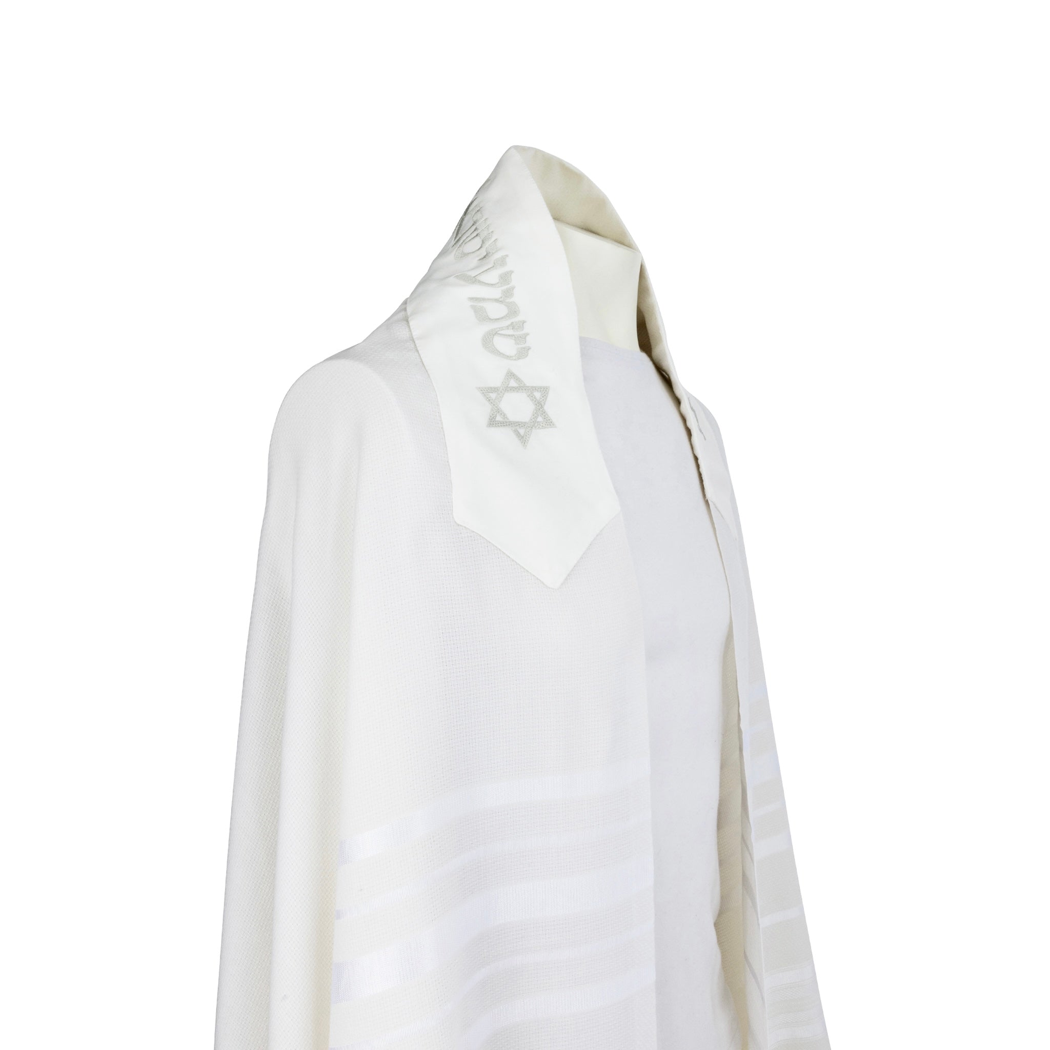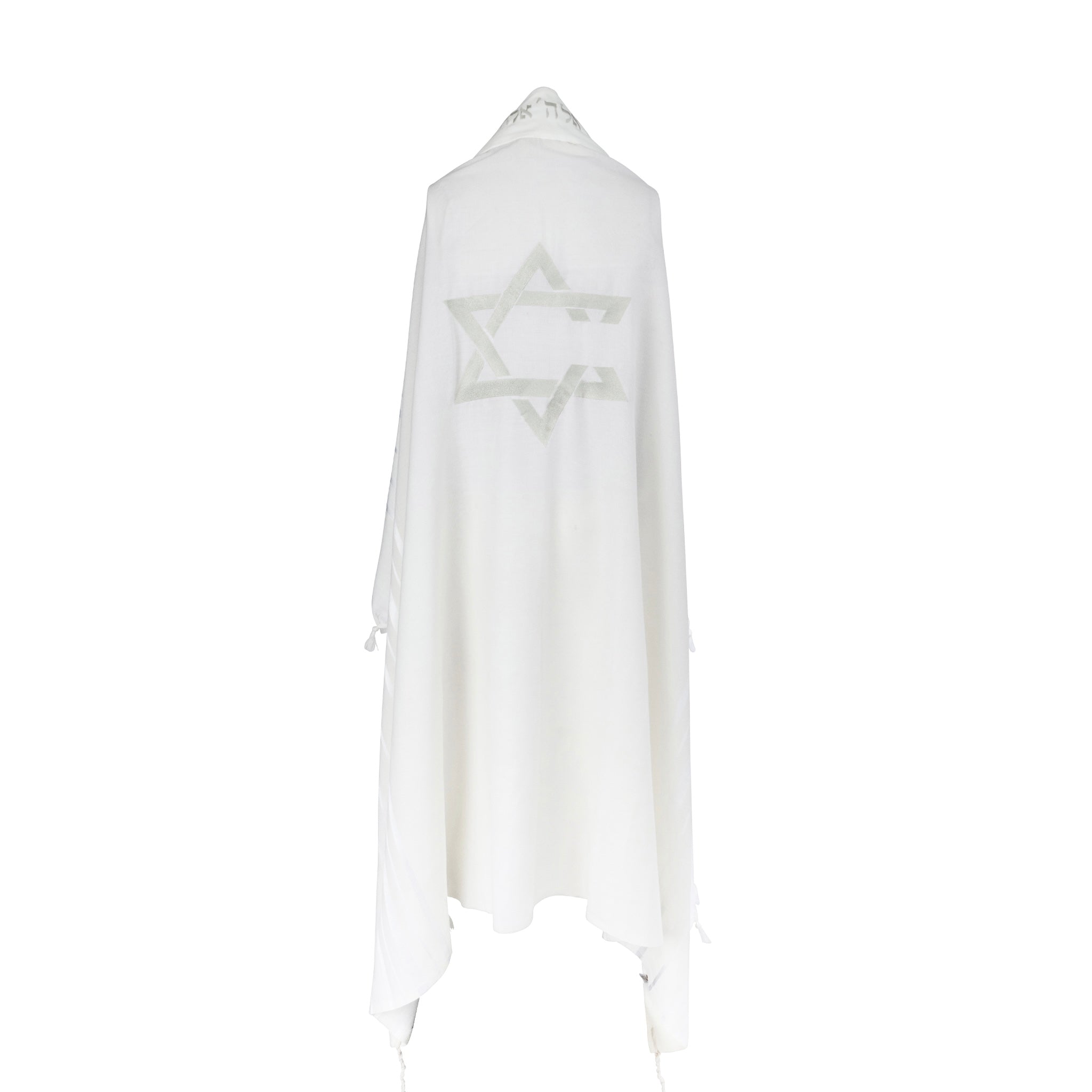 A unique prayer shawl that will look stunning during synagogue services and Jewish holidays. This exquisitely crafted design features the Star of David embroidered on the back and a phrase of your choice embroidered in white on the collar (atara).
