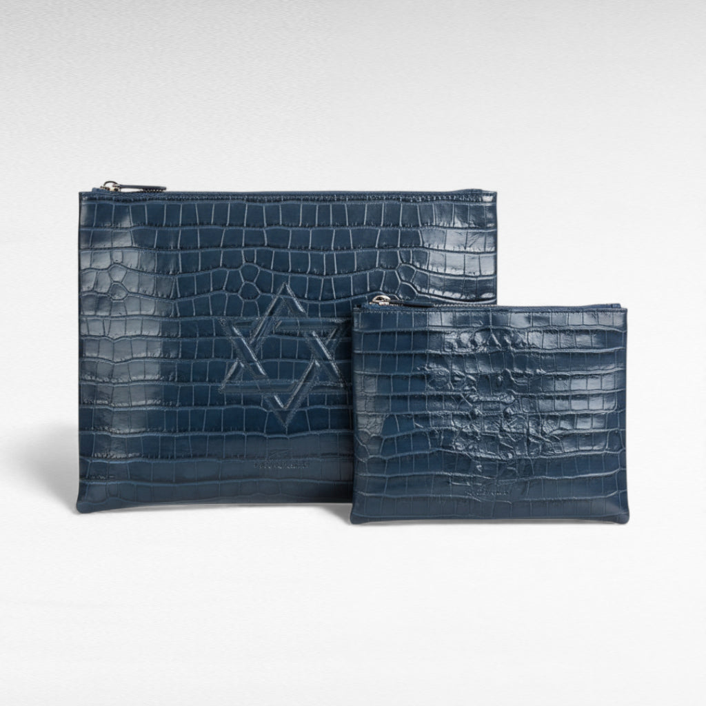 הסט כולל שתי נרתיקים אלגנטיים מעור כחול בגימור קרוקו, ייעודיים לטלית ולתפילין, עם הטבעת מגן דוד עדינה בגוון זהה לעור – חלק בלתי נפרד מהחומר עצמו.